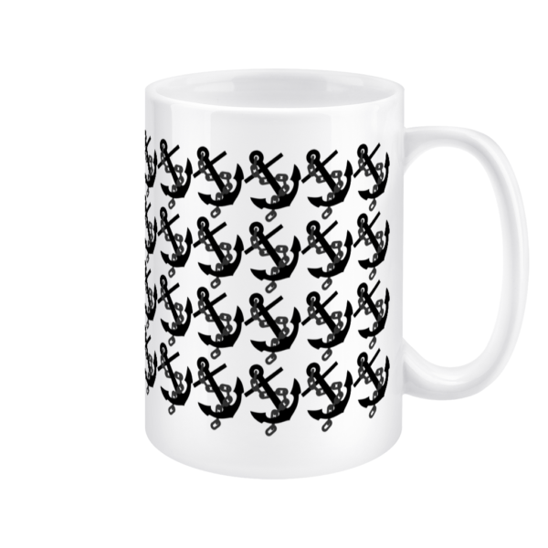 Anchors 15oz glossy white ceramic mug. Dishwasher & Microwave safe.