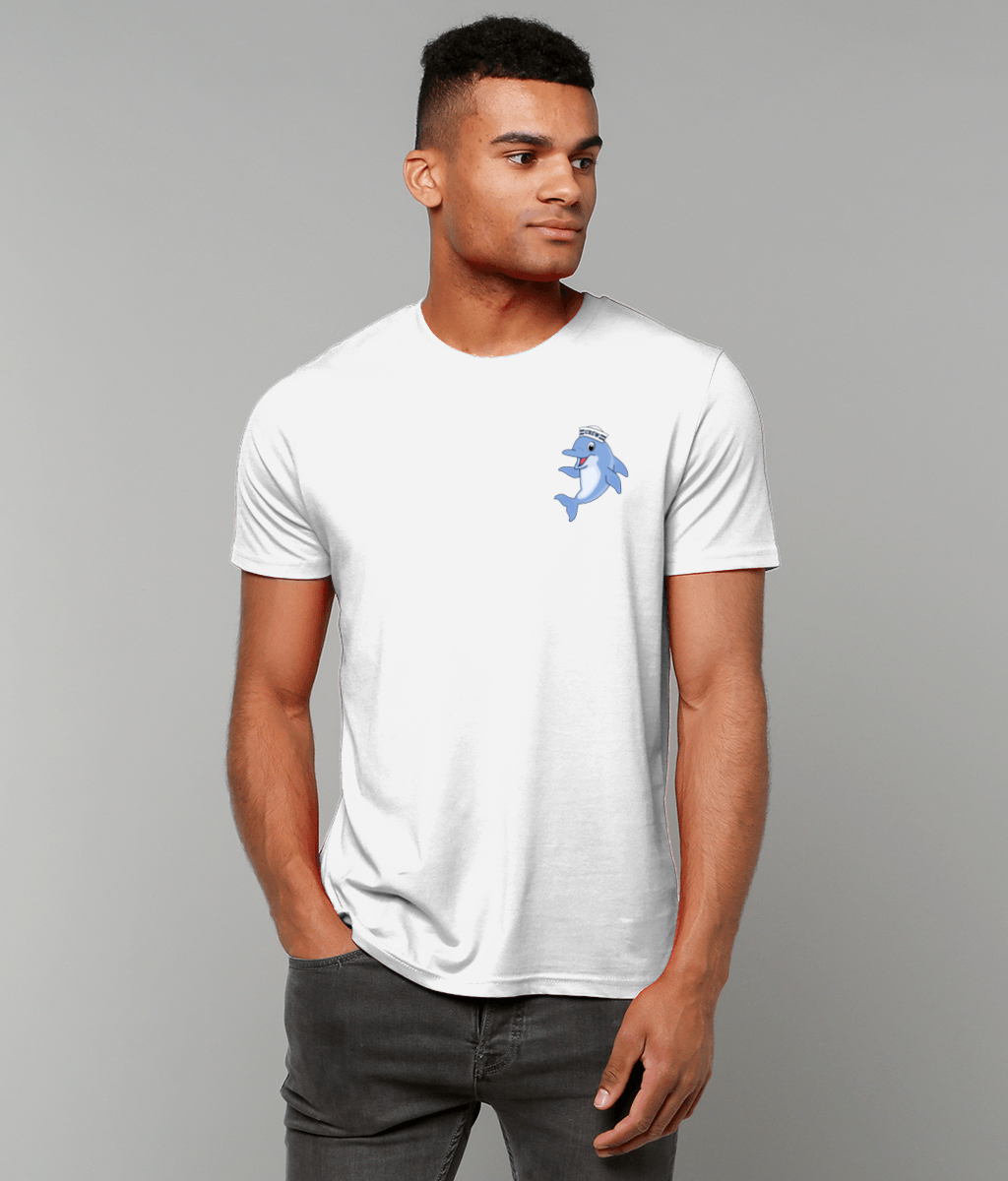 Dolphin in Crew Hat Logo T-Shirt – 100% organic, available in 4 colours from XX-Small to 3XL